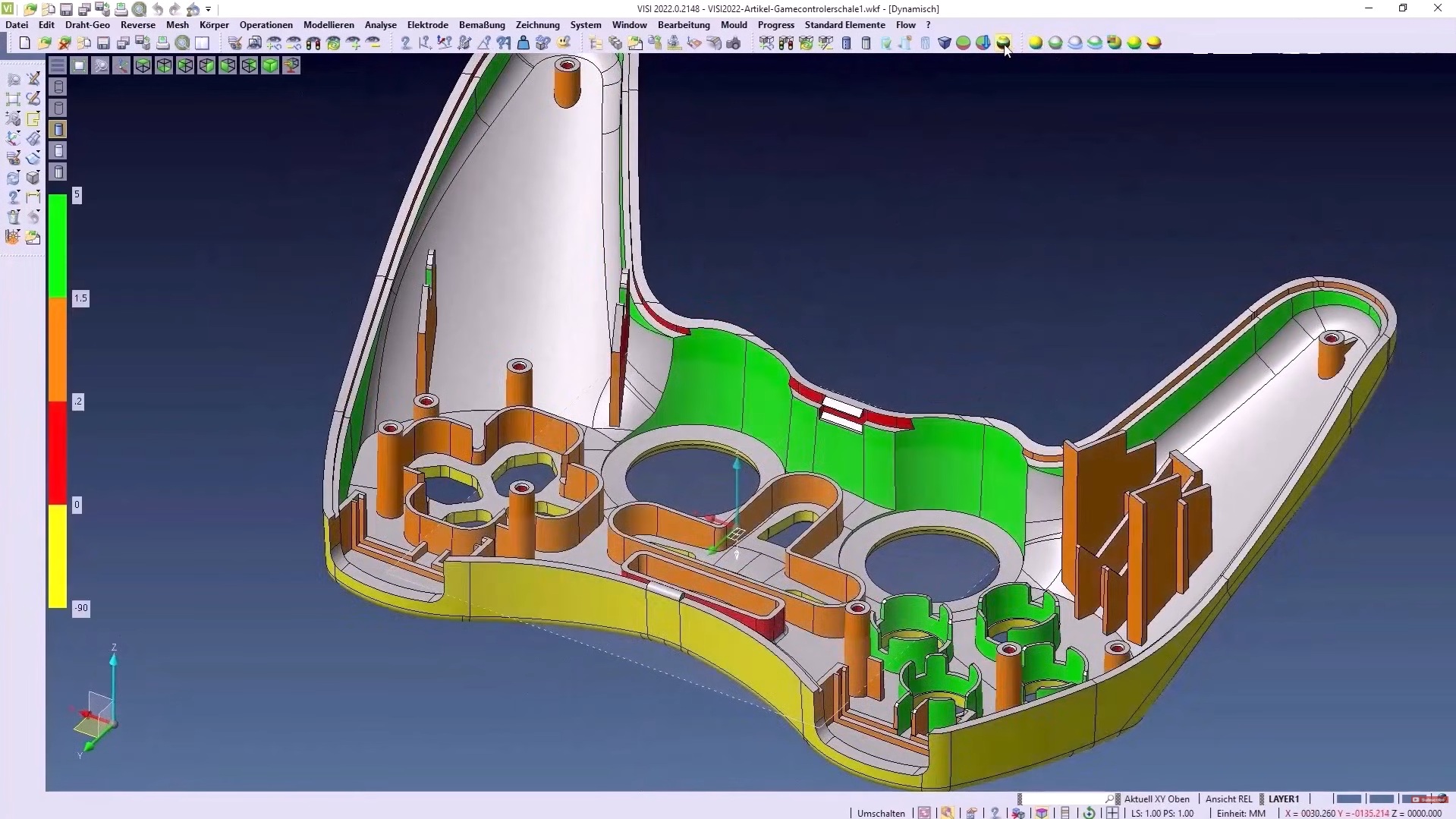L’analisi degli angoli di spoglia è il primo passo nella verifica di un modello prima di procedere nella fase di progettazione dello stampo. Poter identificare possibili problemi progettuali in questa fase, significa ridurre notevolmente i tempi di progettazione. Qui il sistema evidenzia con colori differenti le zone del modello con angoli di spoglia impostati. È quindi possibile poter identificare zone di sottosquadro per decidere come meglio intervenire nella fase progettuale. Il sistema consente inoltre di verificare i raggi di curvatura del modello, colorando tali zone con colori differenti e di identificare automaticamente i raggi minimi e raggio massimo del modello.