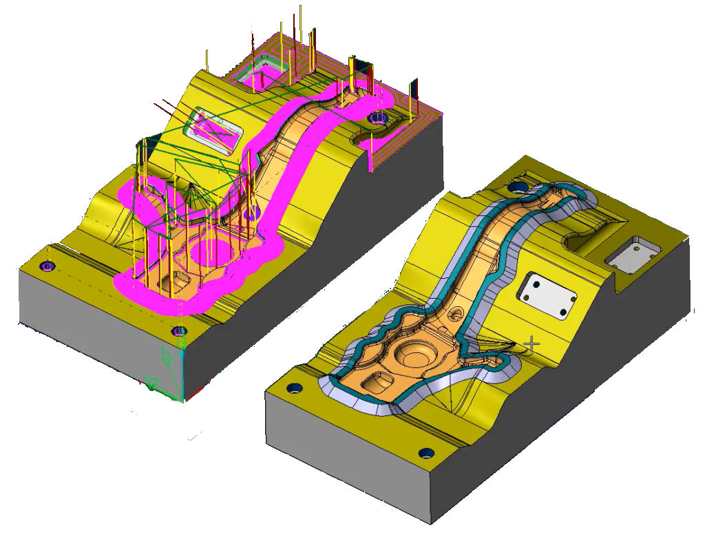 Tutti i percorsi sono controllati per evitare collisioni sia con le superfici da lavorare, sia con le superfici adiacenti. In più, negli spigoli interni, vengono addolciti con raggi di raccordo per prevenire gli impuntamenti dell’utensile, che possono dar luogo a collisioni altrimenti non rilevabili da un controllo puramente teorico.